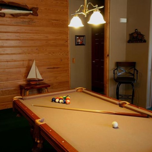 Inside, the Hidden Cove Lake House exudes charming rustic lodge elegance, with tasteful furnishings and interior decor that create a warm and inviting atmosphere. The spacious and fully equipped kitchen is designed to bring everyone together, with an opening that connects directly to the game room, making it easy to entertain and enjoy each other’s company. The game room itself is a highlight, featuring a pool table that promises hours of fun.