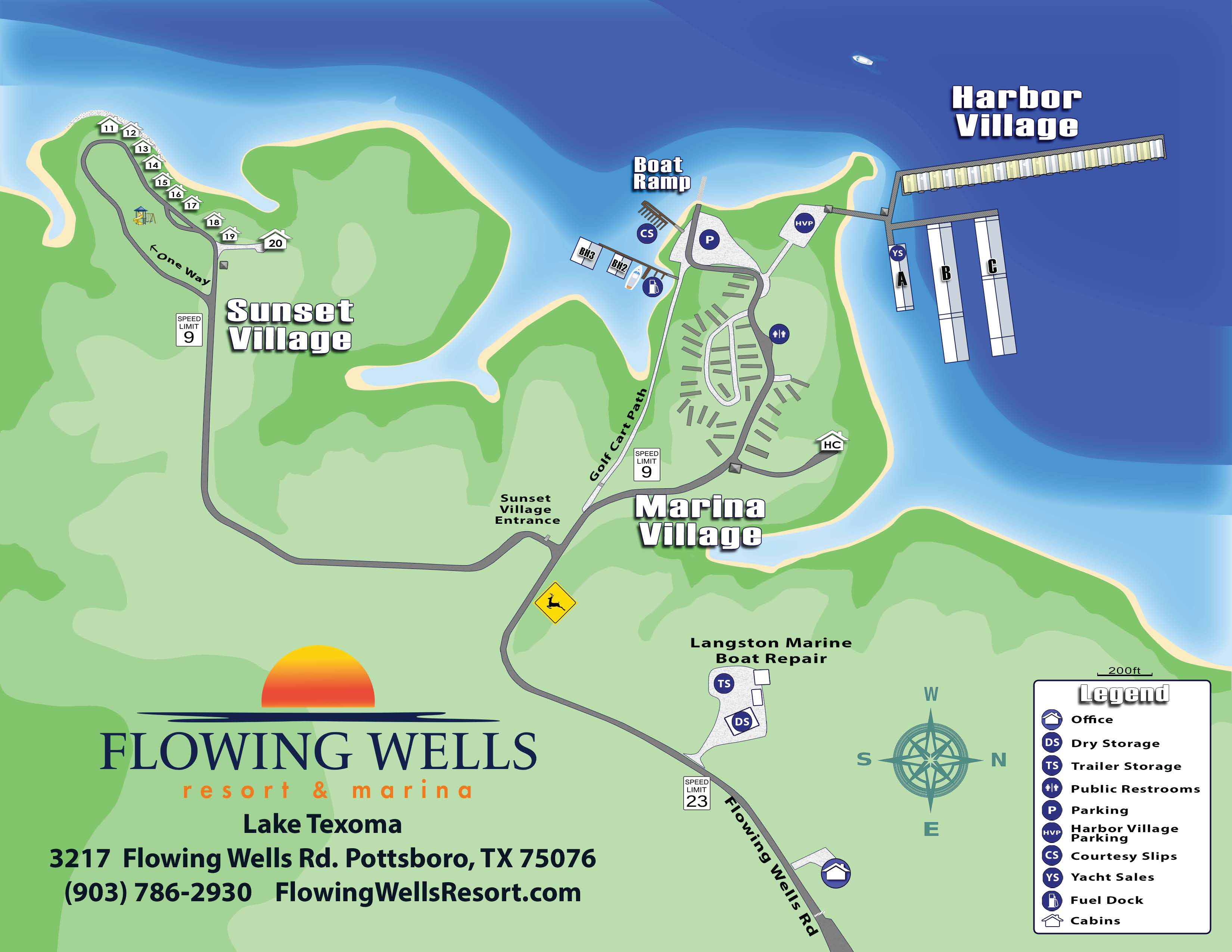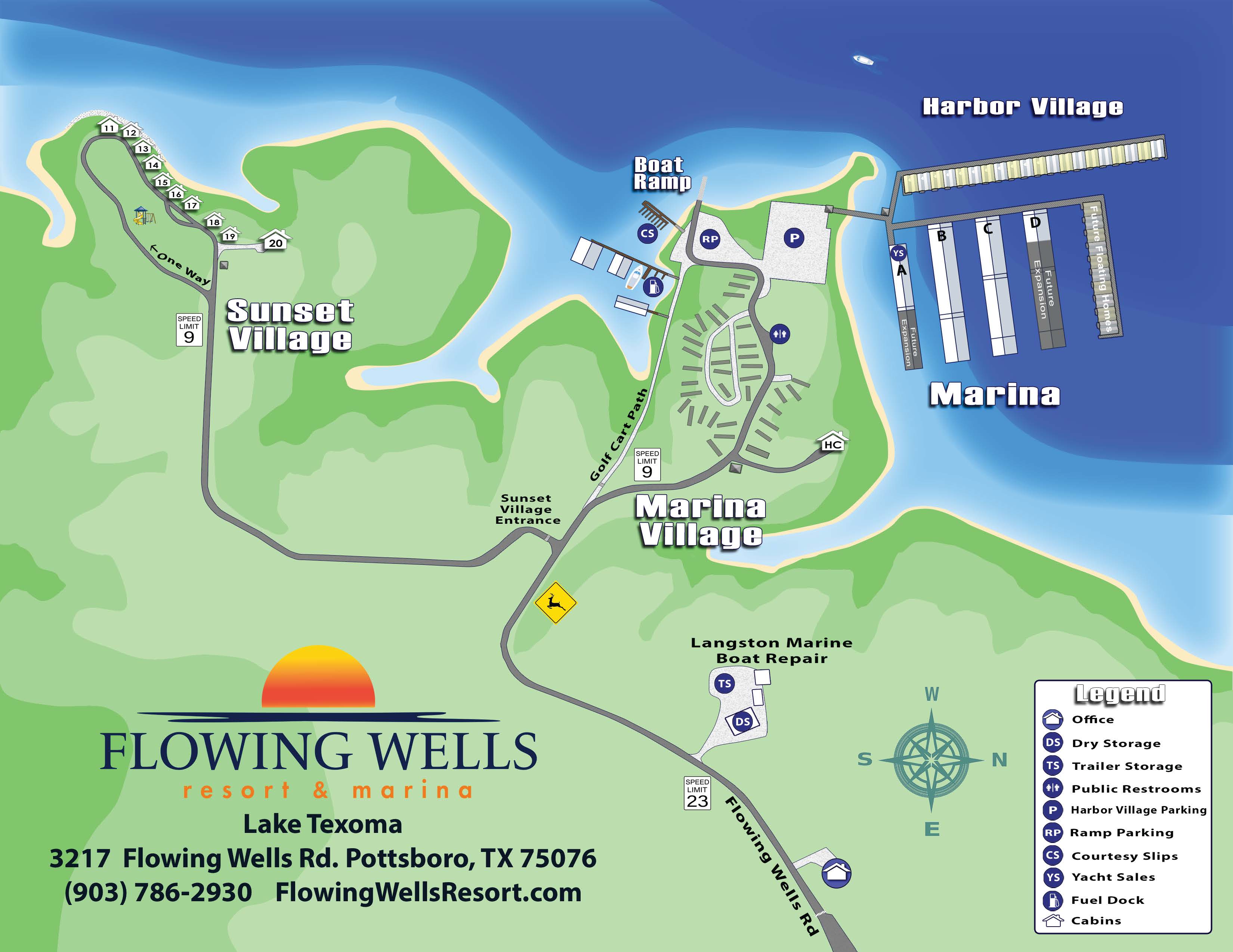 Flowing Wells Resort & Marina is conveniently the closest Texoma marina to the Dallas/Ft. Worth metropolis. The gated Resort & Marina offers 210 covered slips ranging from 32 up to 56 feet in length with optional custom boat lifts, boat ramp, on-site boat services, fuel dock, mobile pump-outs, courtesy patrol, yacht brokerage, boat dealer, dry storage, trailer storage, PWC slips and more.